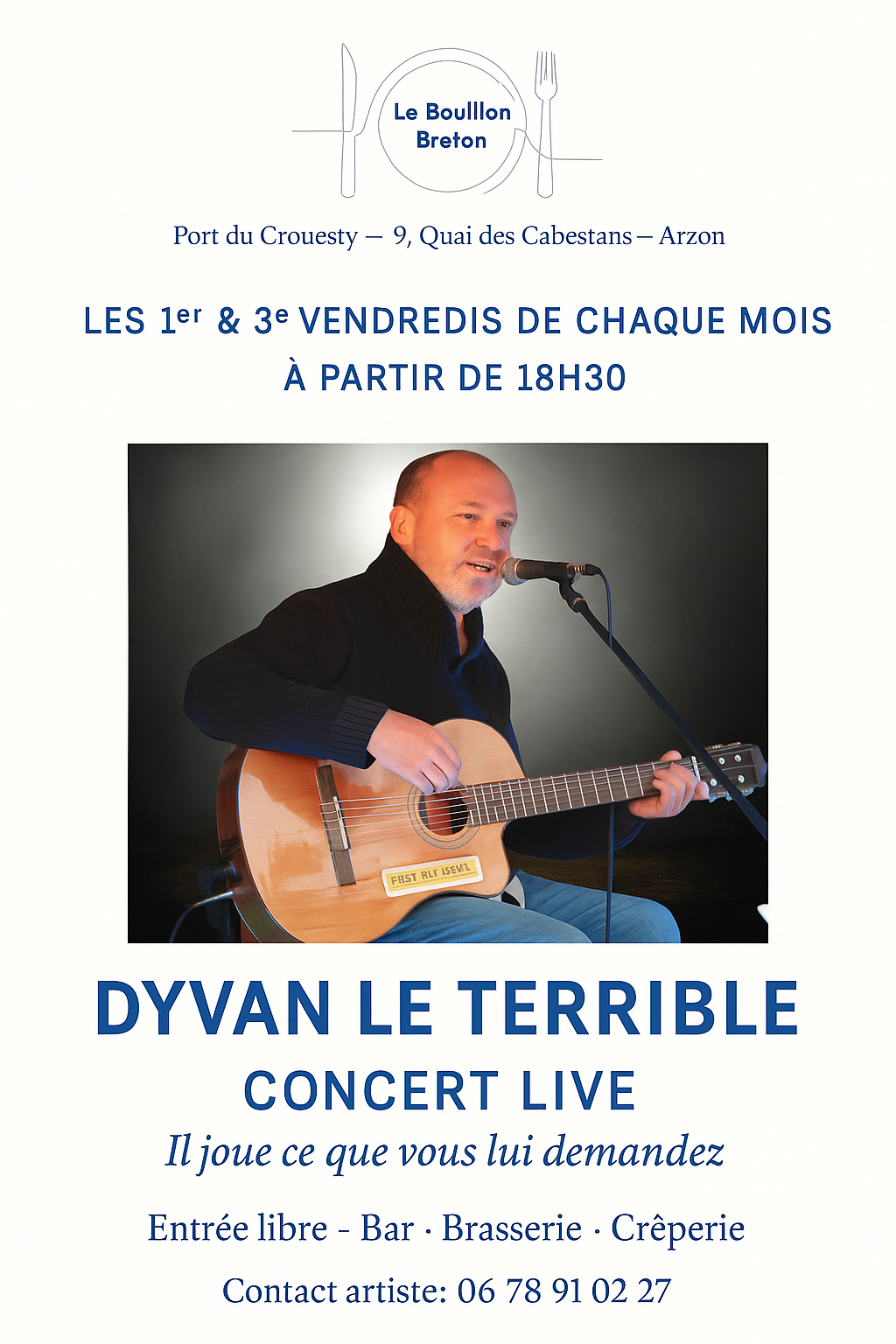 Retrouvez l’ambiance chaleureuse du Bouillon Breton avec un artiste unique : Dyvan le Terrible, guitariste talentueux qui joue… exactement ce que vous lui demandez !